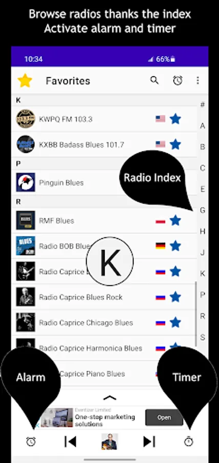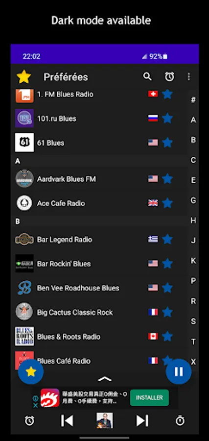 - Timer: 5, 10, 15, 30, 45, 60 (1h), 90 (1h30) or 120 (2h) minutes. Note that you can choose to pause the current radio or to close the whole application when the timer ends!