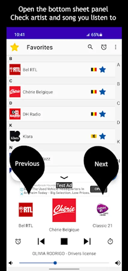 - Simple: A single button to launch the radio and pause it. Simply select the radio to listen to it ! Display artist and song you listen to.
