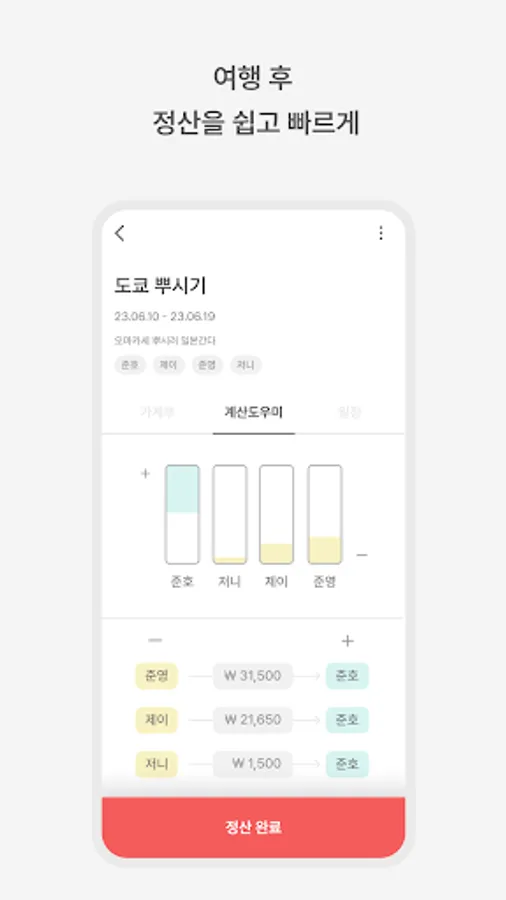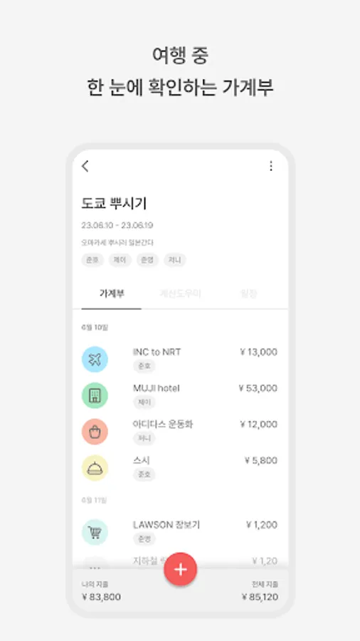 저니리스트 가계부에서 친구들과 함께 간 여행의 지출 내역을 편리하게 기록하고 정리할 수 있어요.
