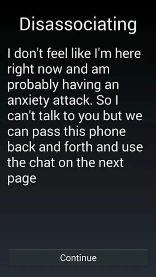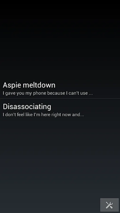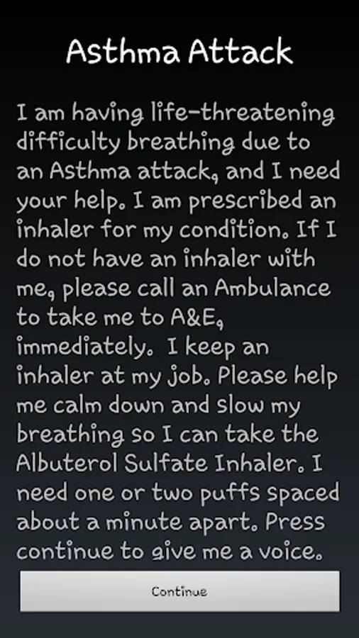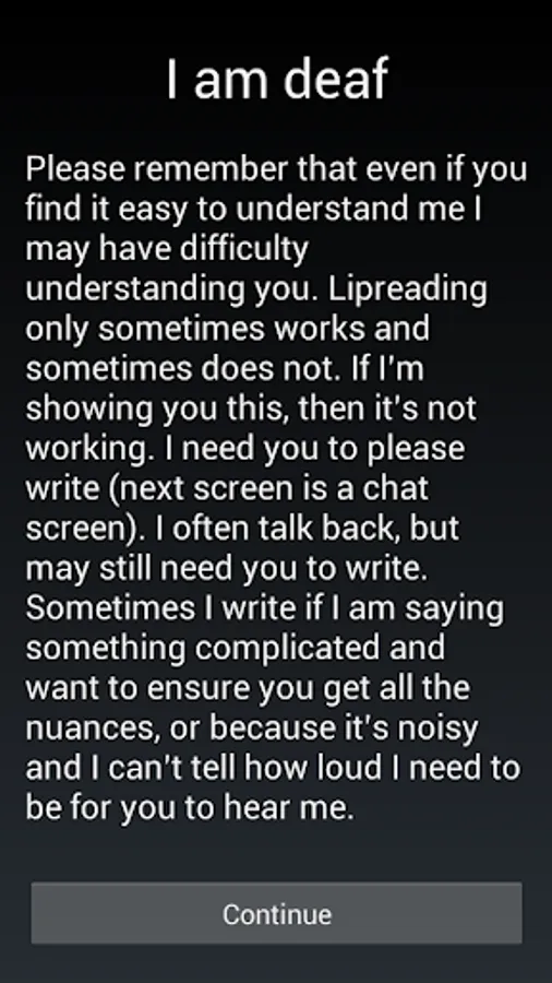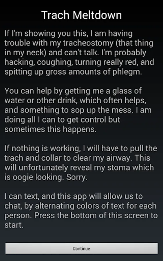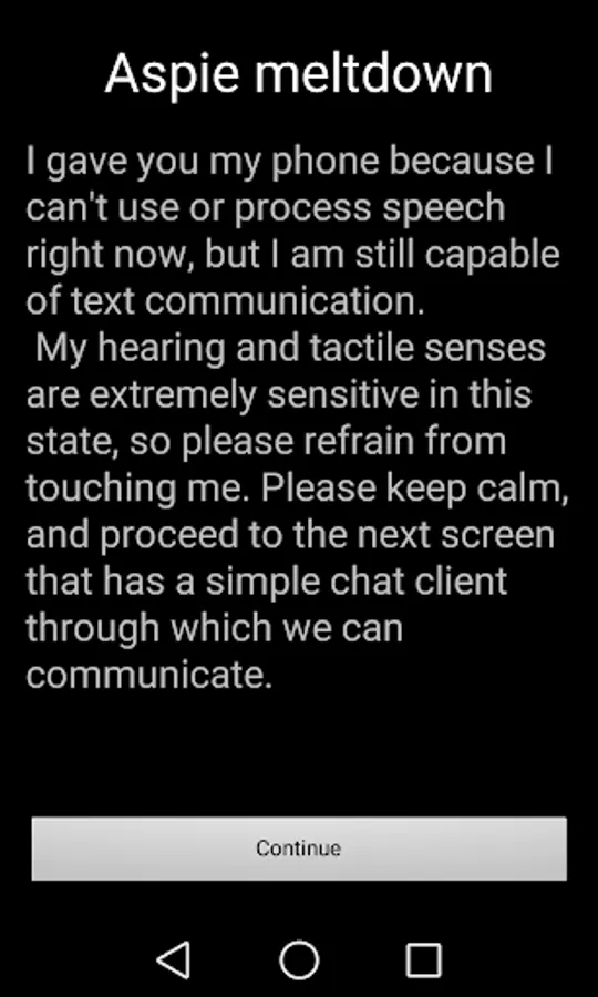 The splash screen has a base text that explains to the person you gave your phone to that you can't use speech and want to use this app to communicate. The default text is aimed at people experiencing an autistic meltdown, where their speech centres stay non-functional for a while even after they've recovered.