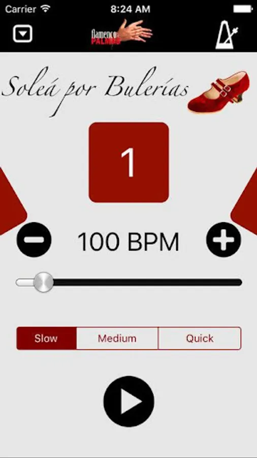 2. You can use it as a flamenco metronome, selecting any palo (style) and its speed, clapping sound or metronome with accents, and it will sound continuously until you want.