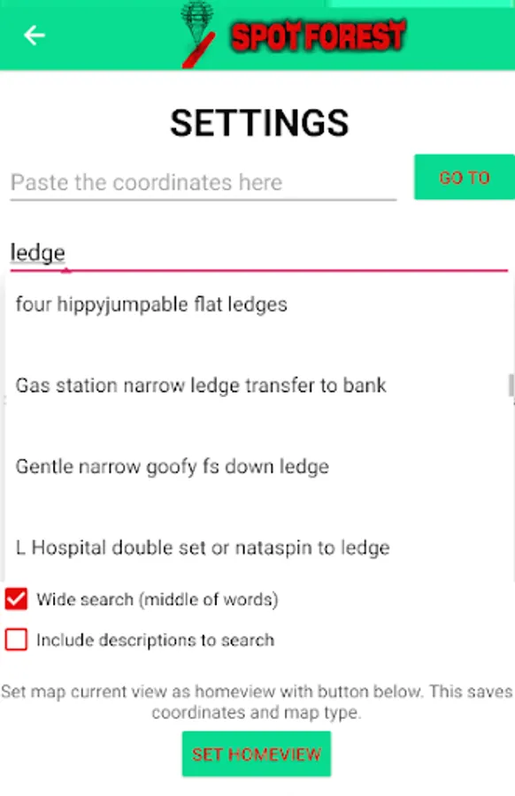 Of course we have search bars, categories to filter, coordinates to navigate and multiple languages. In addition we got list view that can sorts the spots by distance and shows compass. And guess what? You can change the initial point for the list view! You can also minimize individual spots' opacity and save those to file. Then send that file to your friend and you both have same spots left visible. Great tool to plan a tour or skate day!