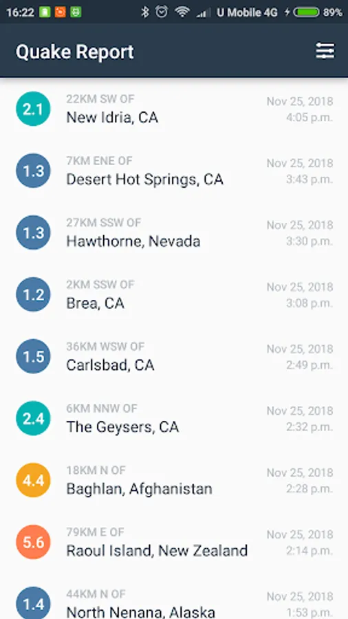 This app display a list of recent earthquakes in the world from the U.S. Geological Survey (USGS) organization, which developed during Udacity's Android Basics: Networking Course.