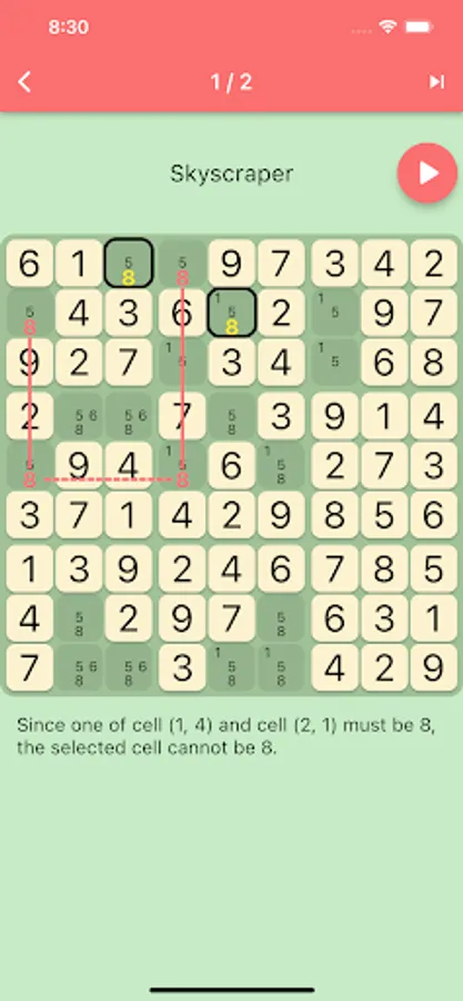 Animation display, easy to understand. Each technique has detailed instructions and animations. Techniques include Last Value, Hidden Single in box, Hidden Single in line, Pointing, Claiming, Naked/ Hidden Pair, Triplet, Quad, X-Wing, Swordfish, Jellyfish, Skyscraper, Two Strings Kite, Turbot Fish, X-Chain, Group X-Chain, XY-Chain