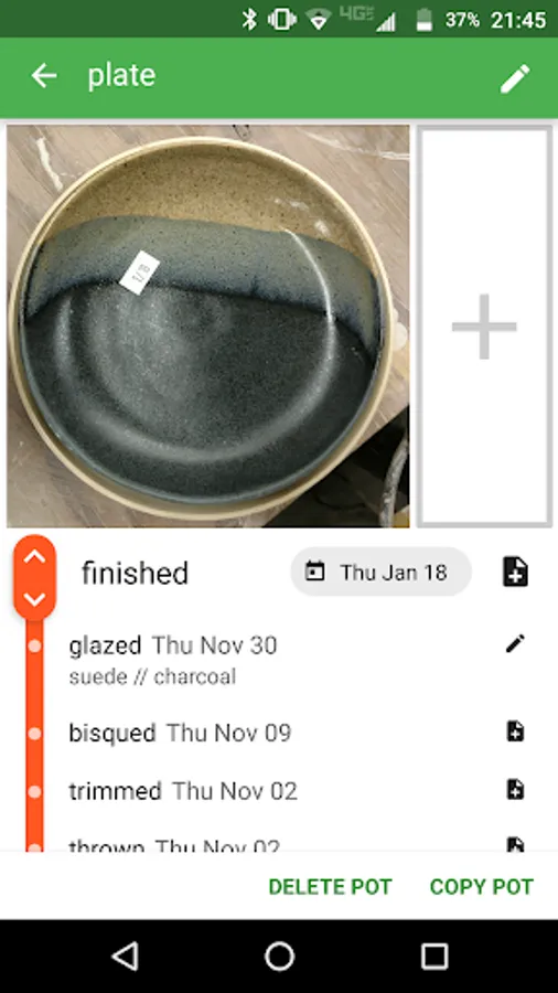 Pottery Log keeps track of your ceramics throughout their creation lifecycle. Add photos and notes for each stage: throwing, trimming, bisquing, and glazing.