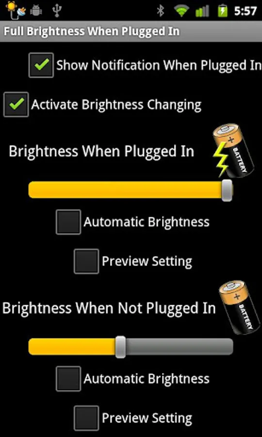 This is an application that changes the screen brightness to a user defined setting on plugging in the charger, and to a different setting on unplugging the charger.