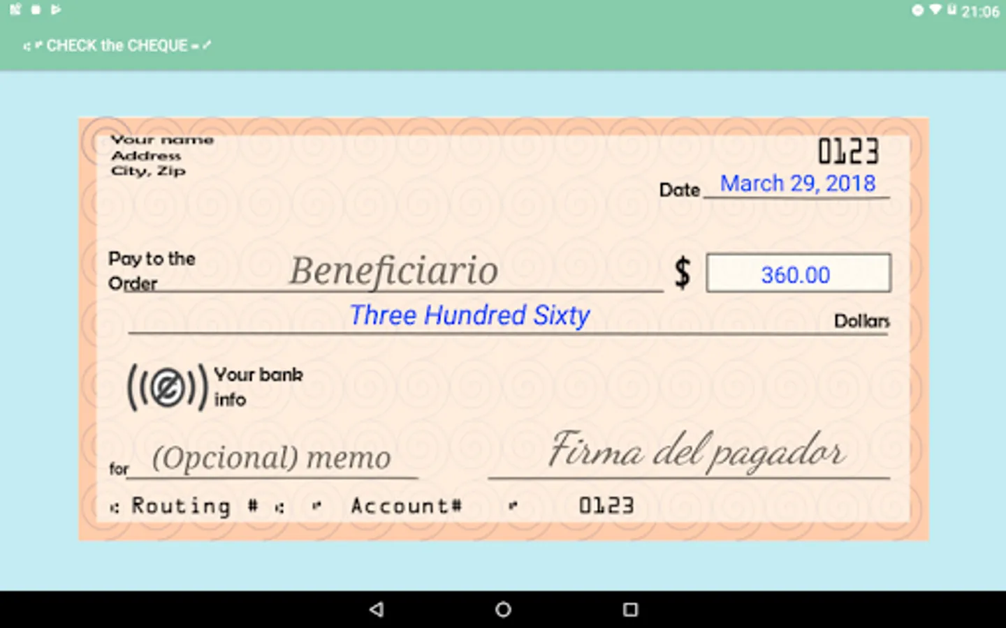 La "Línea Legal" está debajo del beneficiario, que traducirá el valor numérico en palabras. Entonces, si escribe 17, la aplicación lo traducirá a "Diecisiete" o 17000 a "Diecisiete mil" en Inglés ("Seventeen" y ""Seventeen Thousand").