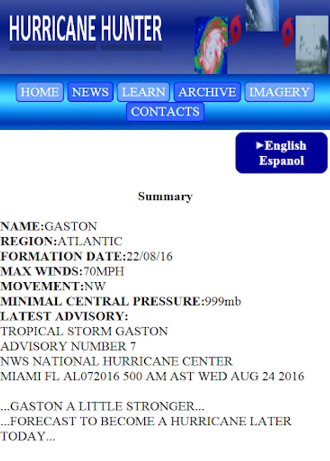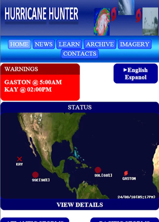 With Hurricane Hunter you can track every Tropical Storm in the Atlantic or Pacific region, with up-to-date information, you will get advisories, warnings, alerts, track images, winds images or satellite images. Also a list of all tropical storm names that may form in the current hurricane season!