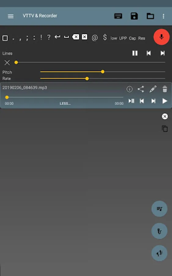 -An Audio Player is used to play and pause a file so that you can use Voice to Text (red microphone) and capture the results.