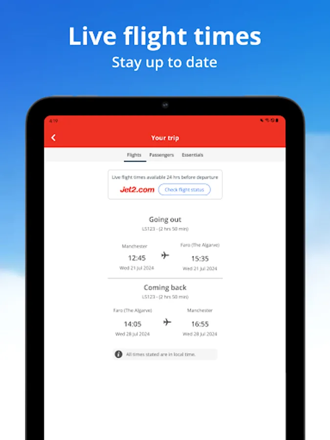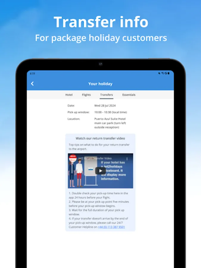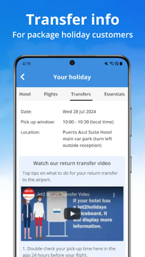- While you're travelling: We've made your booking details more accessible, with all the important information you need to know in one place. For flight-only bookings, that includes your flight's status, and for package holiday bookings, you'll see your hotel details, travel vouchers, transfer information and exciting excursions available in your resort. To make your journey easier, you can upload and view all your travel documents in one handy area too. There's also easy access to our latest travel safety information.