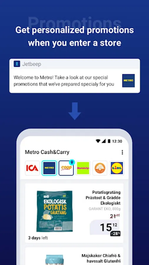 JetBeep mobile application substitutes plastic loyalty cards and irrelevant promotions, which people receive in the wrong place and at the wrong time. At the entrance to the store, covered with our device, JetBeep will send you a single push notification with personalized promotions tailored specially for you. At the checkout, you can seamlessly transfer your loyalty card by tapping our device and all your coupons and discounts will automatically apply.