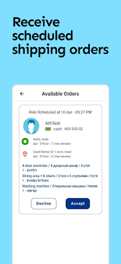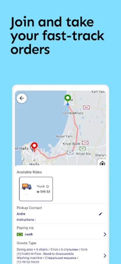 Once your documents have been verified, you will be able to receive orders through the JetBox Partner app. Orders will display customer contacts, loading address, unloading address, floor, flat, what things need to be moved, disassembled and assembled.