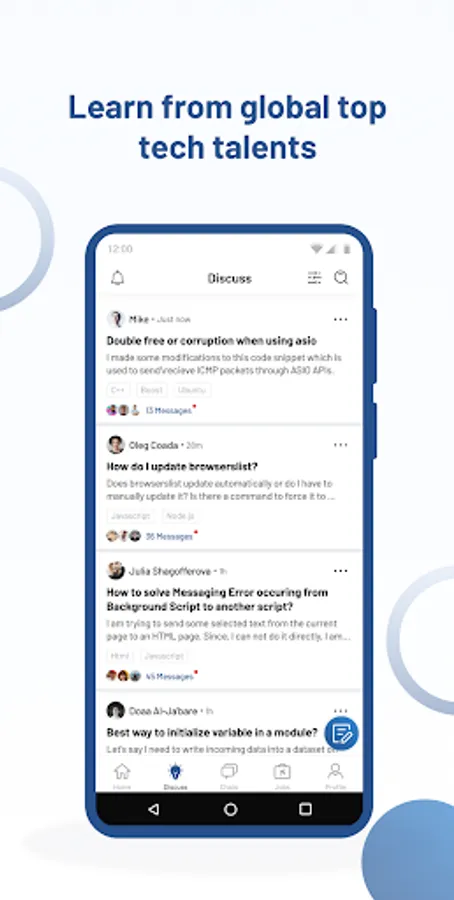 - Ask and discuss challenging and interesting software development questions and topics in the live Discuss channel; enjoy the process in your native language through real-time translations.