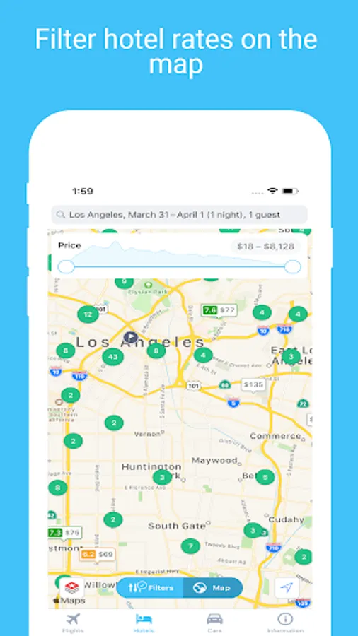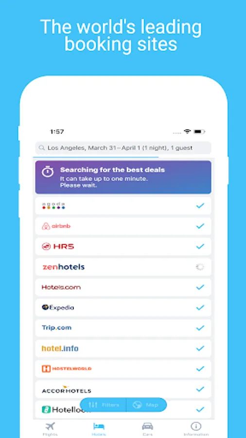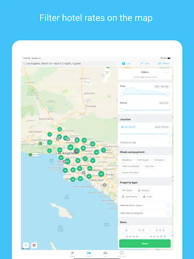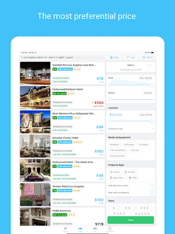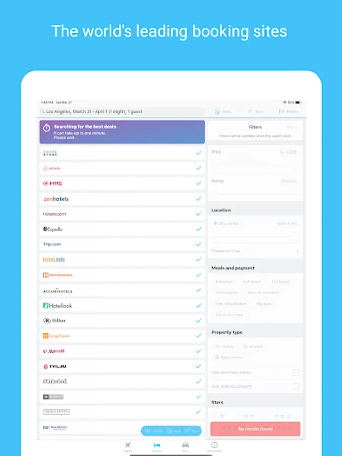 In addition to helping you find airline tickets, we also help you find accommodation. Compare prices of thousands of hotels, resorts, apartments and motels worldwide. Or find a room near your current location and hunt for last minute deals.