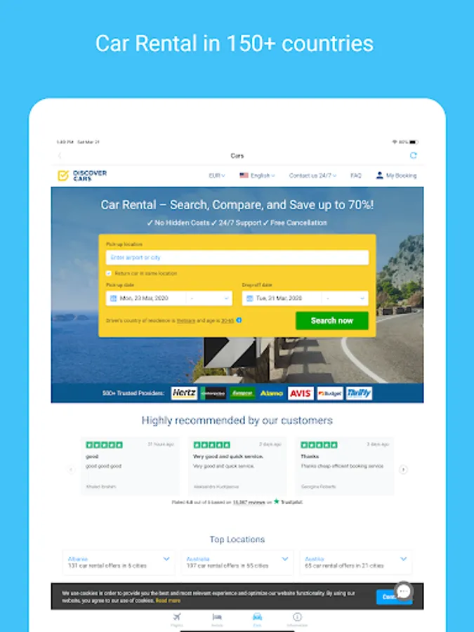Choose the time and location you need to rent a car, and we'll help you find deals. You can search by vehicle type, fuel type and features. You can rent a car in more than 150 countries.