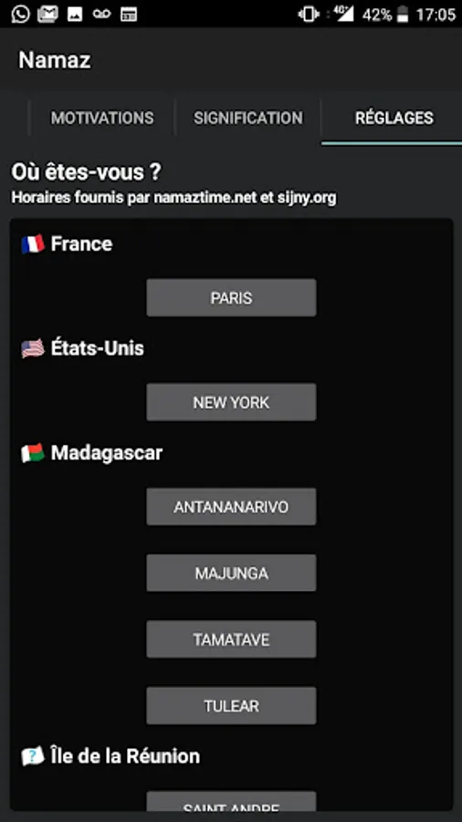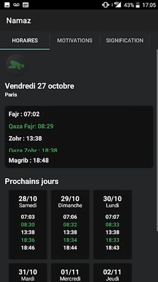 Receive the hours of Namaz: Fair, Sunrise, Zohr, Sunset and Magrib.