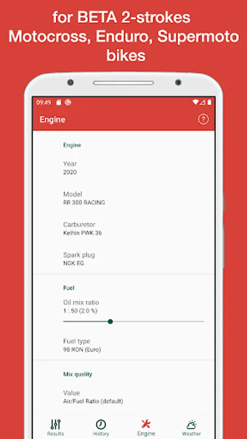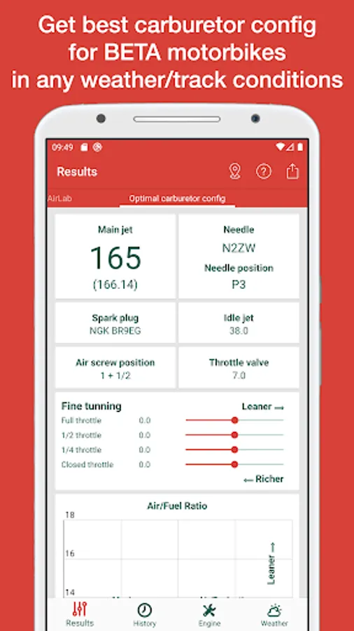 This app is using temperature, altitude, humidity, atmospheric pressure and your engine configuration for calculate optimal jetting (carburetor configuration) and spark plug to use for Beta 2-strokes Enduro, MX moto bikes.