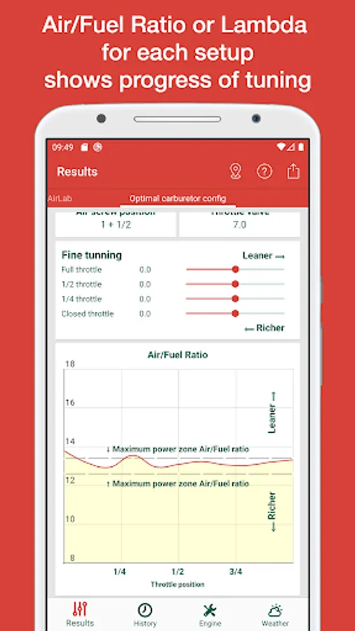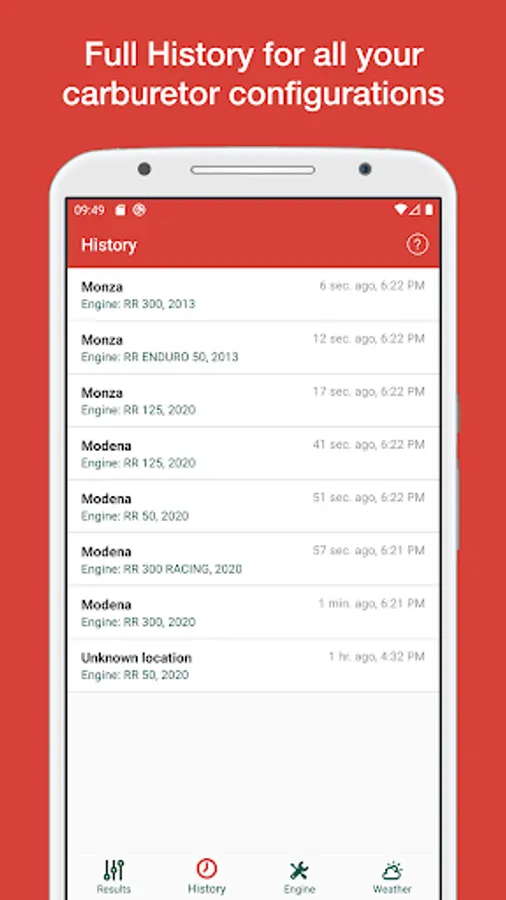 • History: This tab contains the history of all carburetor configurations. If you change the weather, or engine setup, or fine tuning, the new setup will be saved in history.