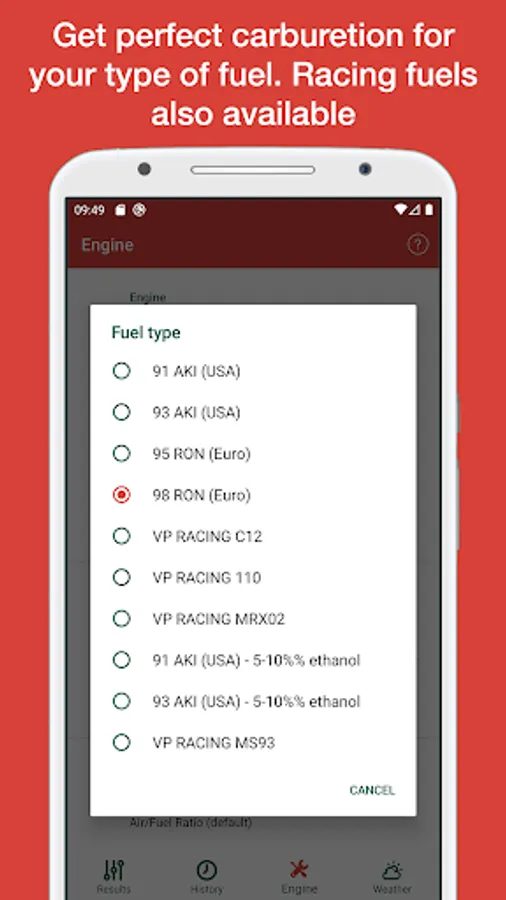 • Selectable fuel type (gasoline with or without ethanol, Racing fuels available, for example: VP C12, VP 110, VP MRX02)