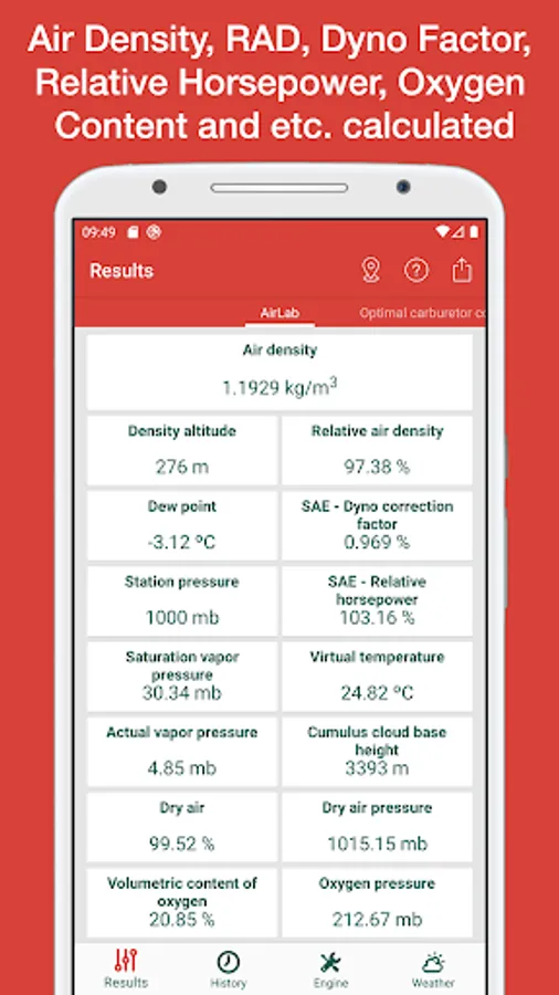 Besides this jetting information, the air density, density altitude, relative air density, SAE - dyno correction factor, station pressure, SAE- relative horsepower, volumetric content of oxygen, oxygen pressure are shown too.