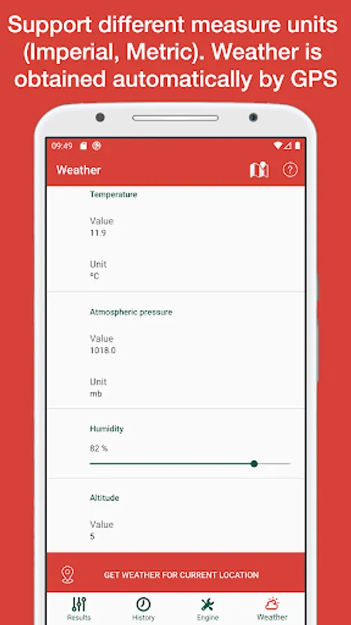 This app can obtain automatically the position and altitude to get the temperature, pressure and humidity from the nearest weather station thought internet. Internal barometer is used on supported devices for better precision. If more accuracy is needed, a portable weather station can also be used. Application can run without GPS, WiFi and internet, in this case user has to give the weather data manually.