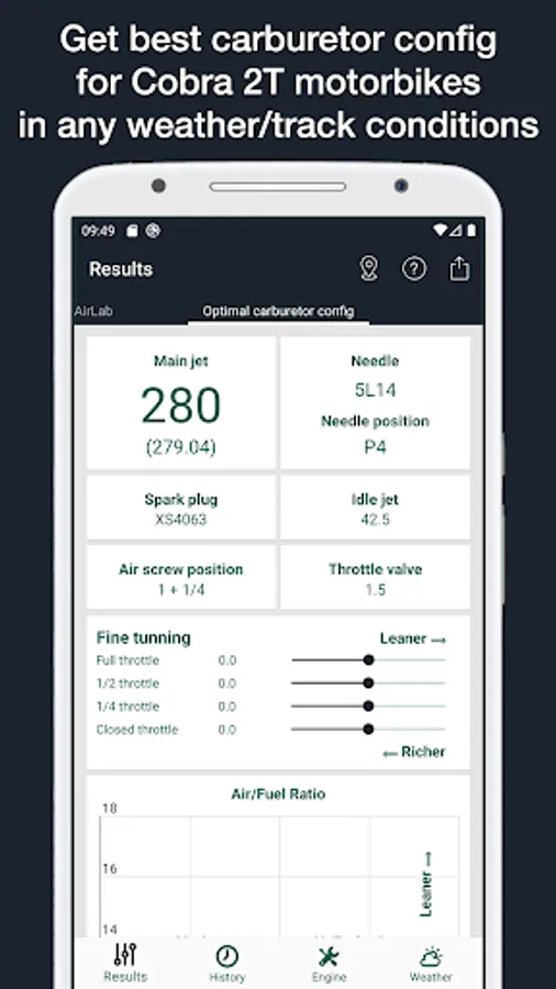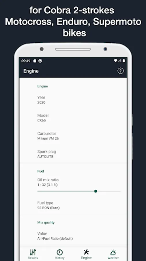 This app is using temperature, altitude, humidity, atmospheric pressure and your engine configuration for calculate optimal jetting (carburetor configuration) and spark plug to use for Cobra Moto 2-strokes MX (Motocross), Enduro, Dirt bikes.