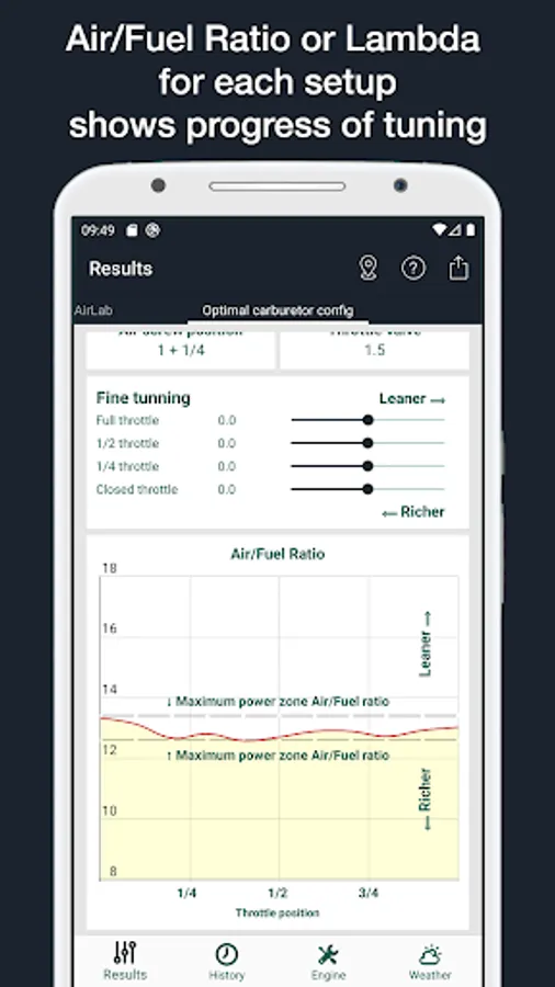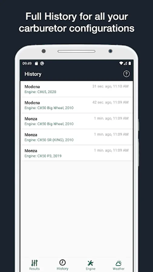 • History: This tab contains the history of all carburetor setups. If you change the weather, or engine setup, or fine tuning, the new setup will be saved in history.