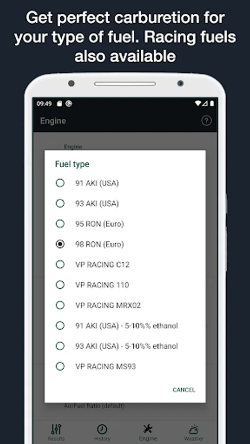 • Selectable fuel type (gasoline with or without ethanol, Racing fuels available, for example: VP C12, VP 110, VP MRX02)