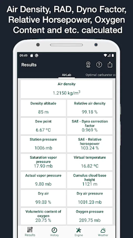 Besides this jetting information, the air density, density altitude, relative air density, SAE - dyno correction factor, station pressure, SAE- relative horsepower, volumetric content of oxygen, oxygen pressure are shown too.