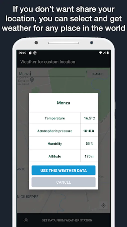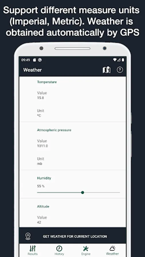 This app can obtain automatically the position and altitude to get the temperature, pressure and humidity from the nearest weather station thought internet. Internal barometer is used on supported devices for better precision. If more accuracy is needed, a portable weather station can also be used. Application can run without GPS, WiFi and internet, in this case user has to give the weather data manually.