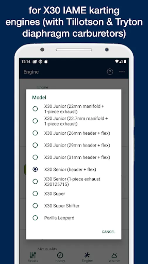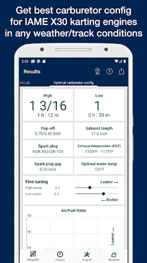 This app provides, using temperature, altitude, humidity, atmospheric pressure and your engine configuration, a recommendation about optimal carburetor config (jetting) for karts with IAME X30, Parilla Leopard, X30 Super 175 engines which use a Tillotson or Tryton diaphragm carburetors