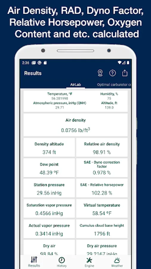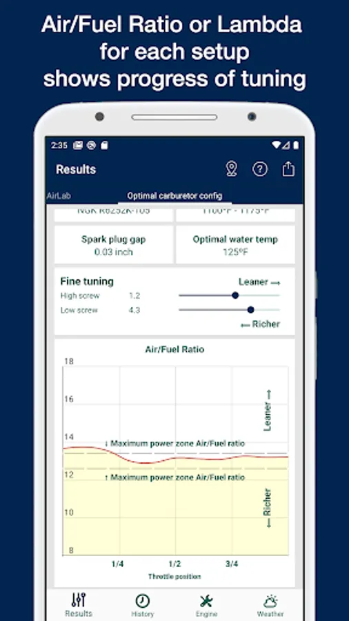 • Results: In this tab high speed screw position, low speed screw position, pop-off pressure, optimal exhaust length, spark plug, spark plug gap, optimal exhaust temperature (EGT), optimal water temperature are shown. These data are calculated depending on the weather conditions and the engine configuration given in the next tabs. This tab lets do a fine tuning adjustment for all this values to adapt to the concrete engine. Also the air density, density altitude, relative air density, SAE - dyno correction factor, station pressure, SAE- relative horsepower, volumetric content of oxygen, oxygen pressure are shown too. On this tab, you can also share your settings with your colleagues. You can also see in a graphic form the calculated ratio of air and fuel (lambda).