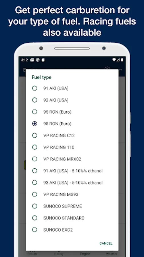 • Selectable fuel type (gasoline with or without ethanol, Racing fuels available, for example: VP C12, VP 110, VP MRX02, Sunoco)