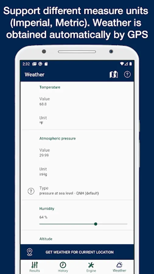 This app can obtain automatically the position and altitude to get the temperature, pressure and humidity from the nearest weather station through the internet. Internal barometer is used on supported devices for better precision. Application can run without GPS, WiFi and internet, in this case the user has to enter weather data manually.