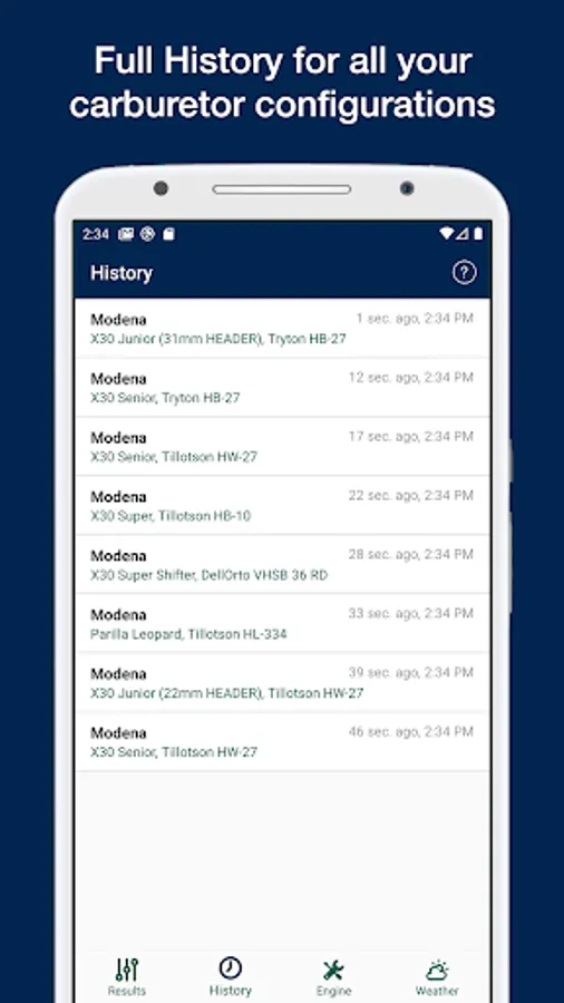 • History: This tab contains the history of all carburetor configs. This tab also contains your favorite carburetor configs.
