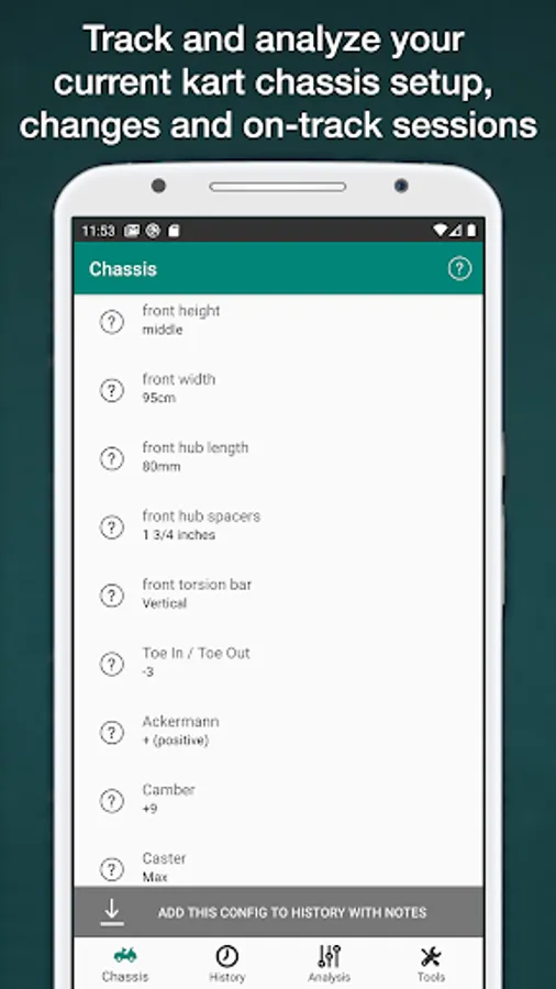 Nº1 application to setup the karting chassis. Professional analysis and tracking current kart chassis setup.