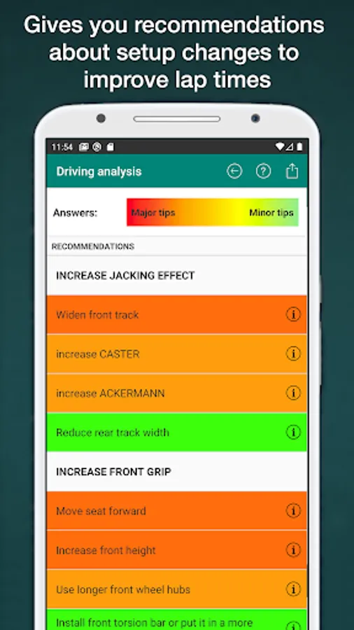 Click on the "Analysis" button and app will show you recommendations related on which adjustments you can do to solve any problem in chassis setup that you can be suffering. A screen with detailed info about each adjustment will be shown. For example: "Insrease front track width", "Modify tyres pressures" (how much you should adjust your pressures), change your driving style
