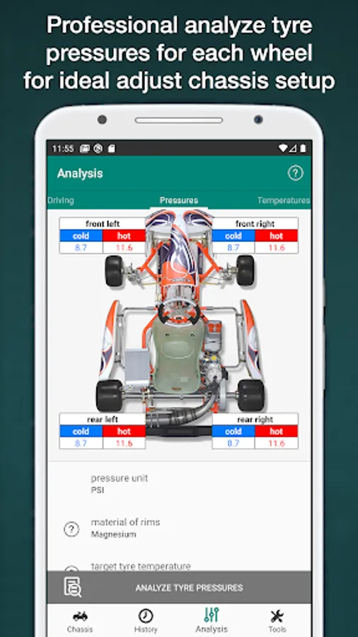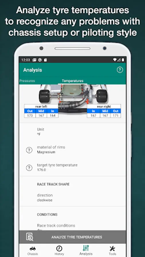 - Pressure analysis: you have to inform about hot and cold pressures of each tyre, material of wheels, target tyre temperature, current weather and race-track conditions