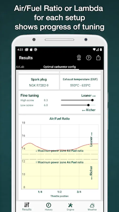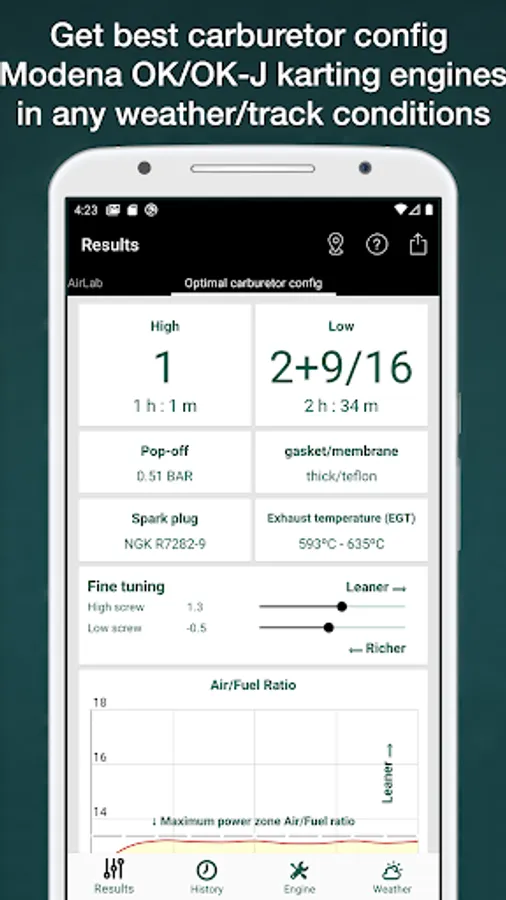 • Results: In this tab high speed screw position, low speed screw position, pop-off pressure, gasket & membrane reccomendation, spark plug, optimal exhaust temperature (EGT) are shown. These data are calculated depending on the weather conditions and the engine configuration given in the next tabs. This tab lets do a fine tuning adjustment for all this values to adapt to the concrete engine. Also the air density, density altitude, relative air density, SAE - dyno correction factor, station pressure, SAE- relative horsepower, volumetric content of oxygen, oxygen pressure are shown too. On this tab, you can also share your settings with your colleagues. You can also see in a graphic form the calculated ratio of air and fuel (lambda).