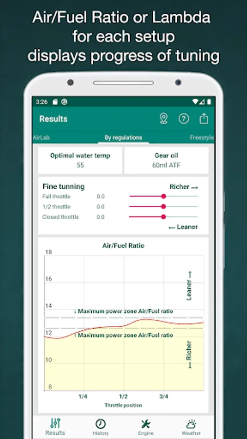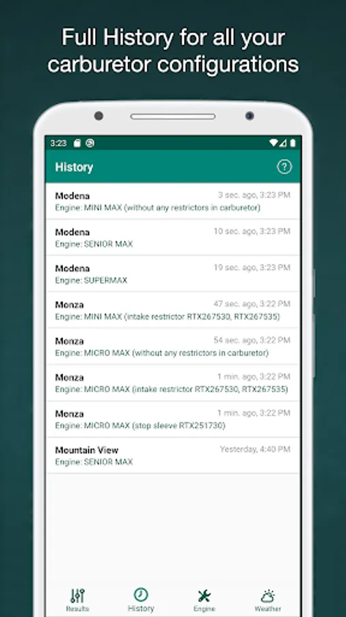 • History: This tab contains the history of all jetting setups. If you change the weather, or engine setup, or fine tuning, the new setup will be saved in history.