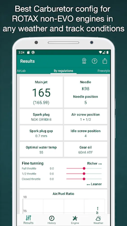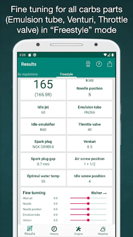 • History: This tab contains the history of all jetting setups. If you change the weather, or engine setup, or fine tuning, the new setup will be saved in history.