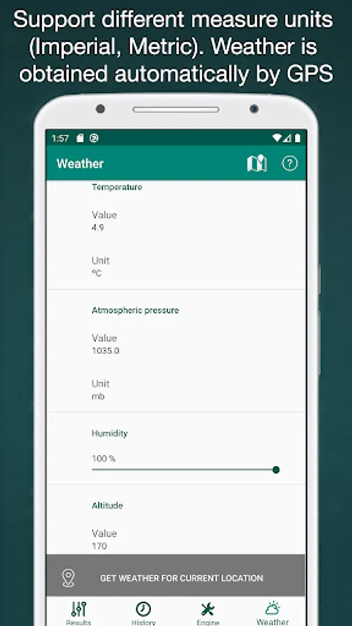 This app can obtain automatically the position and altitude to get the temperature, pressure and humidity from the nearest weather station thought internet. Application can run without GPS, WiFi and internet, in this case user has to enter weather data manually.