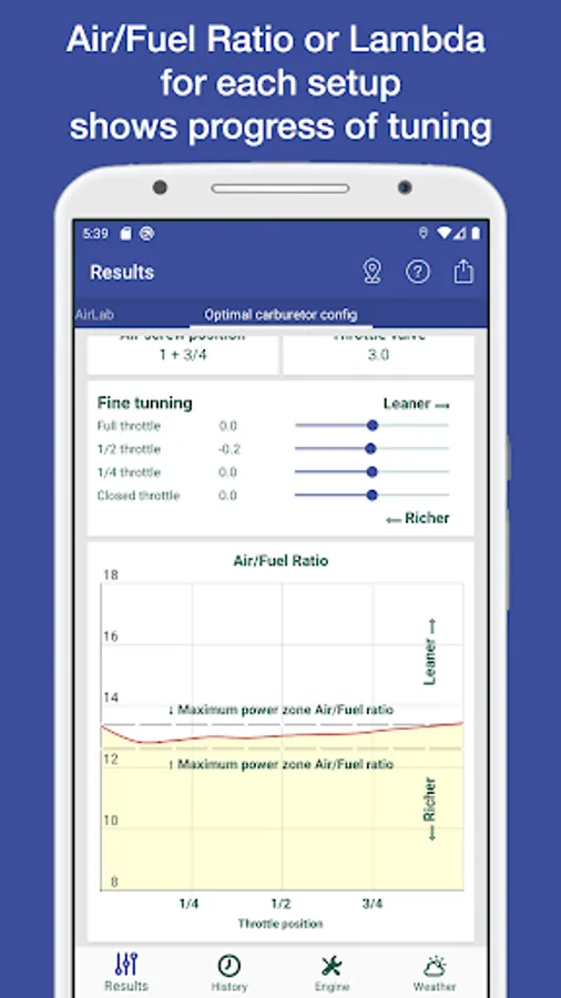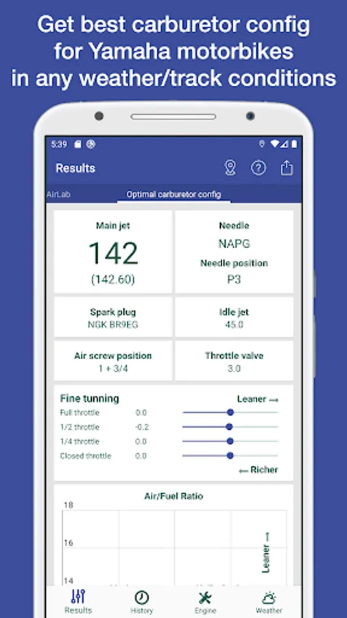 • Results: In this tab main jet, needle type, needle position, pilot jet, air screw position, throttle valve size, spark plug are shown. These data are calculated depending on the weather conditions and the engine configuration given in the next tabs.
