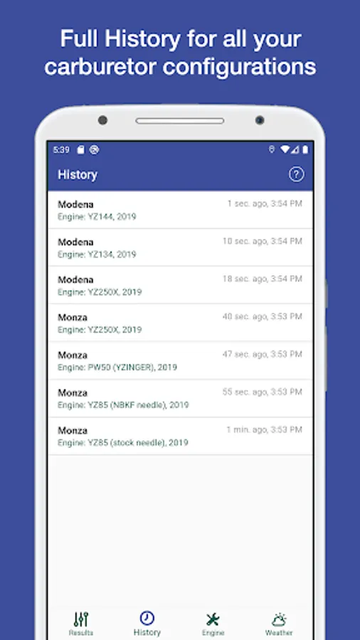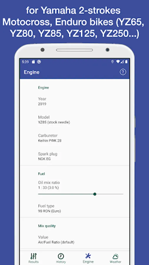 This app provides, using temperature, altitude, humidity, atmospheric pressure and your engine configuration and fuel type, a recommendation about best jetting (carburetor configuration) and spark plug to use for Yamaha 2-strokes MX bikes (YZ and PW models).