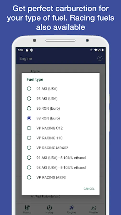 • Selectable fuel type (gasoline with or without ethanol, Racing fuels available, for example: VP C12, VP 110, VP MRX02)