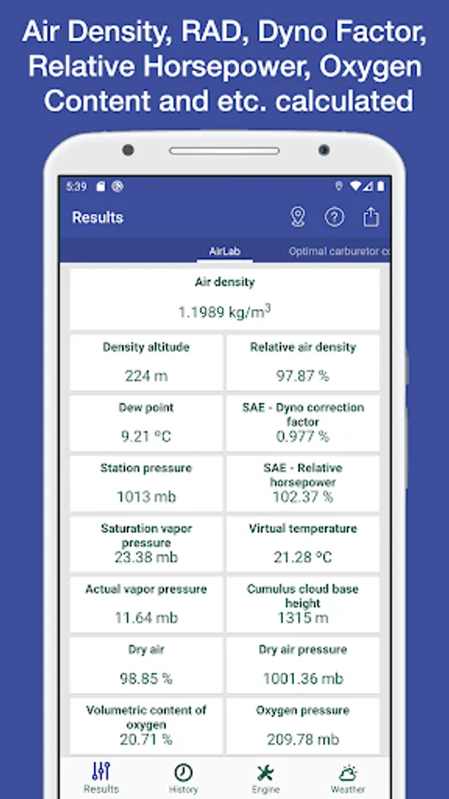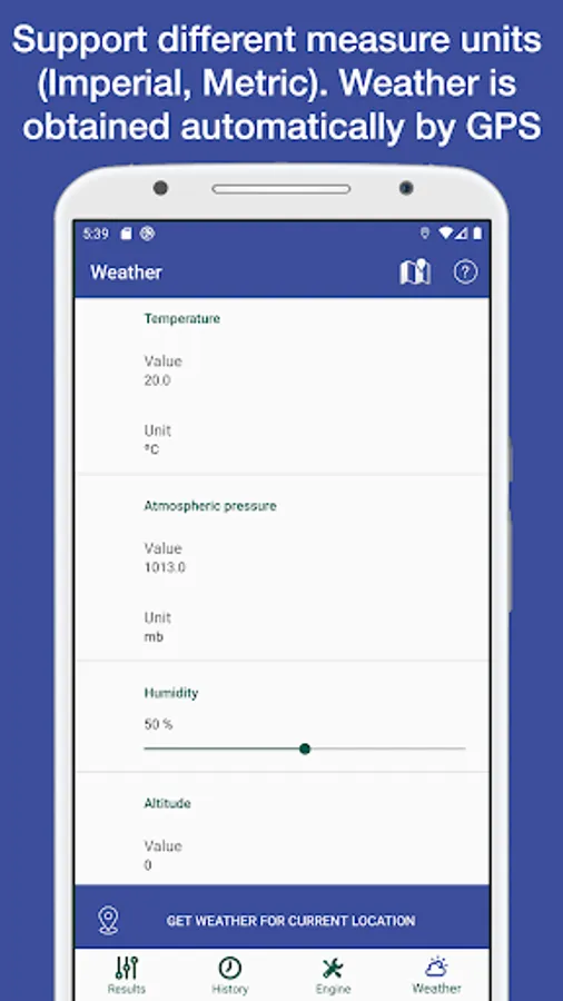 This app can obtain automatically the position and altitude to get the temperature, pressure and humidity from the nearest weather station thought internet. Internal barometer is used on supported devices for better precision. If more accuracy is needed, a portable weather station can also be used. Application can run without GPS, WiFi and internet, in this case user has to give the weather data manually.