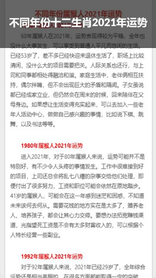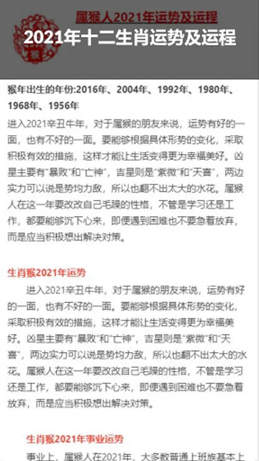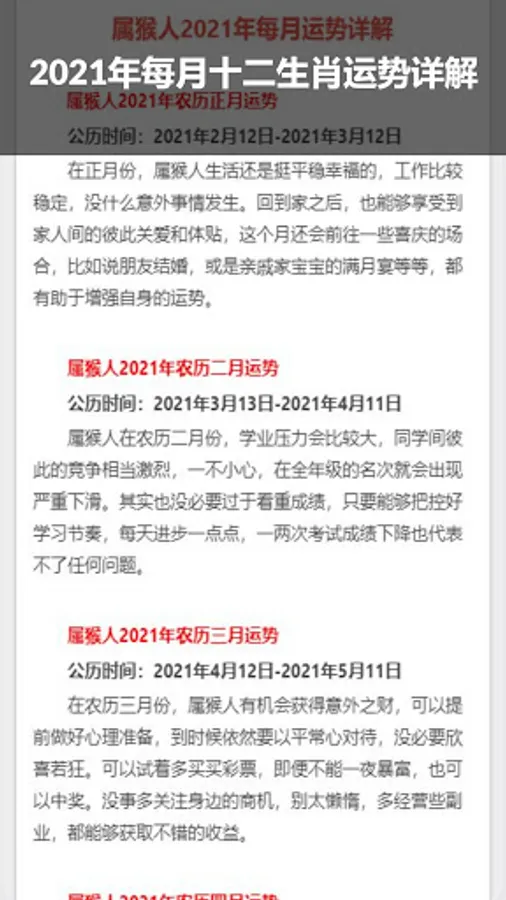 除此之外, 此APP还有不同年份十二生肖在2021的年运势和每个月份的十二生肖详细解说。