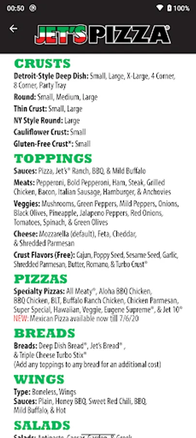 Jet’s Pizza® was founded in 1978 by Eugene and John Jetts in Sterling Heights, MI. We are famous for our Deep Dish style pizza, with the 8 Corner Pizza® being our signature product. We also offer Hand-Tossed Round, Thin Crust, Gluten-Free, and NY Style pizzas, with free flavorized crusts, as well as Jetzees™, Salads, Breads, and more. We only use the highest quality ingredients: