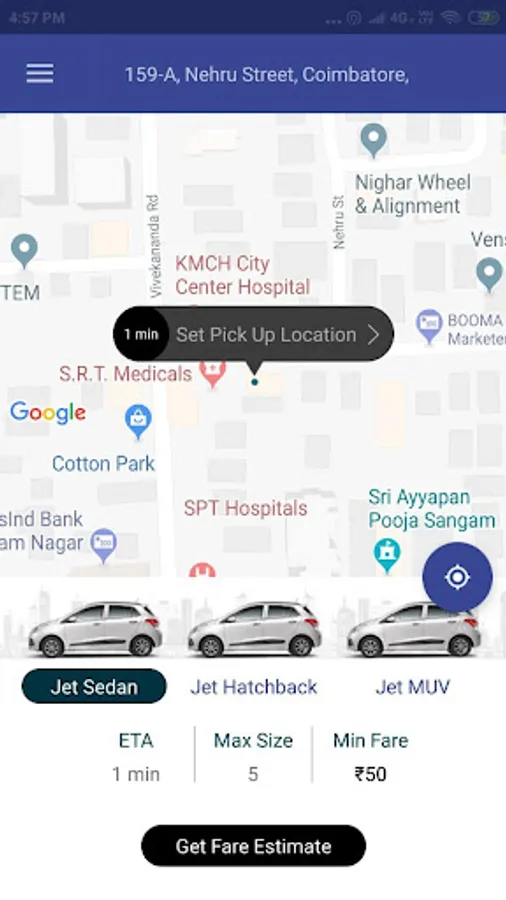 JetTaxi is Coimbatore's Convenient & Reliable Taxi Service Provider. There are Multi Variant Categories such as Sedan, Hatchback, MUV etc... With this application, cab booking can be made within few minutes.