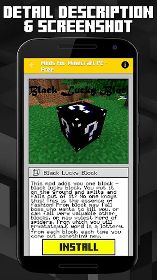 Just choose the mod you like, press Install, and you already have it. Remember that you need BlockLauncher and the official minecraft Pocket Edition app to apply a mod or addon.